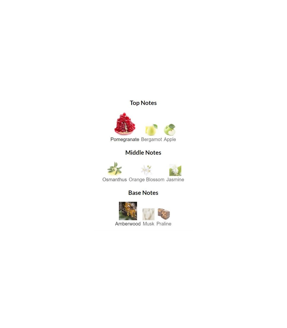 از ترکیبات بکار برده شده در این عطر می توان به ترنج ، سیب ، انار ، یاس، شکوفه پرتقال ، گل اوسمانتوس ، مشک ، پرالین، چوب عنبر اشاره کرد.